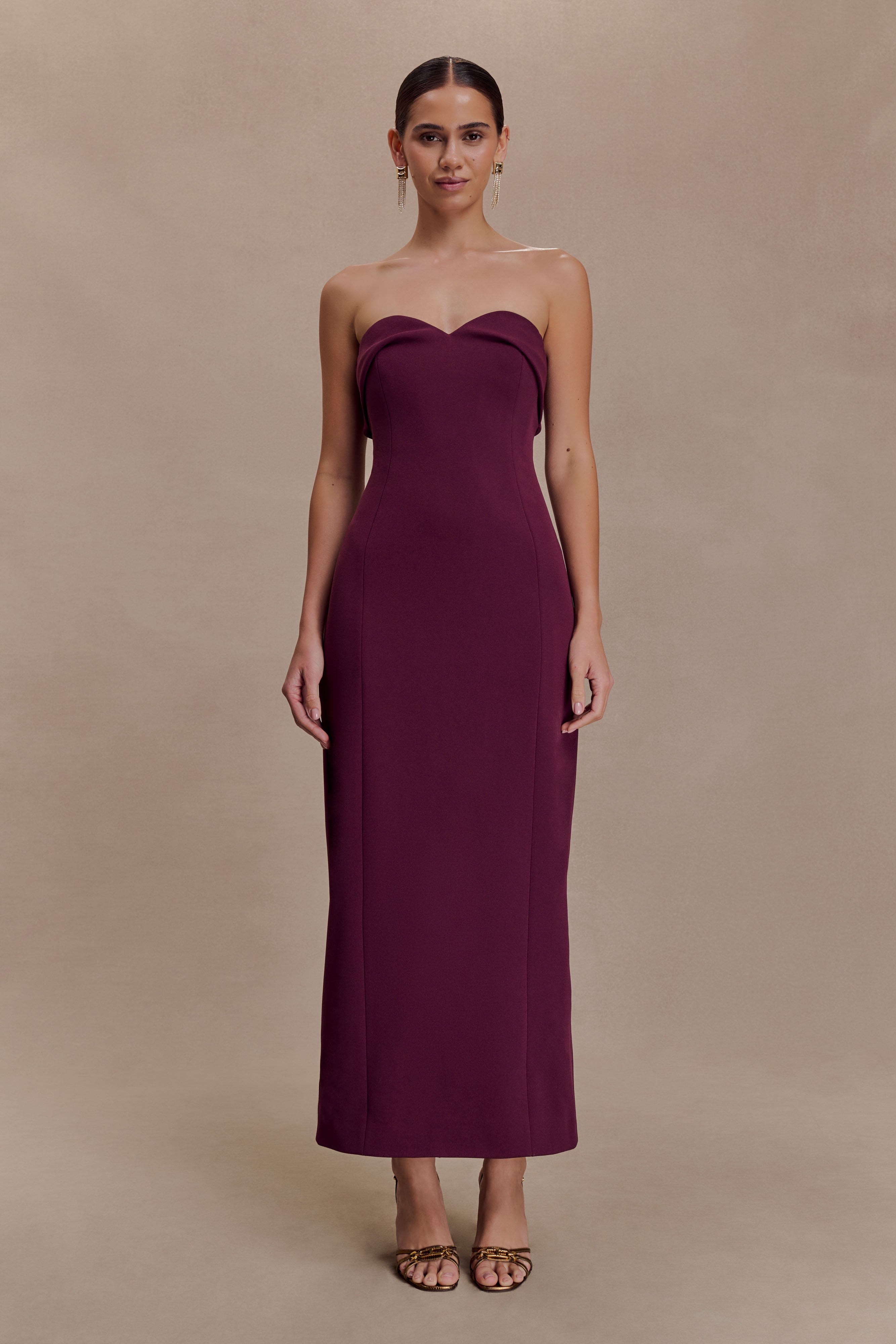 The CARY Folded Strapless Crepe Midi Dress is a timeless silhouette that exudes refined sophistication. Featuring a strapless sweetheart neckline with a folded detail. it enhances the décolletage while maintaining a clean. structured finish. Fully lined for comfort and support. it's completed with a centre back invisible zip and split for ease of movement. Falling to a long midi length. this dress embodies effortless femininity — minimal. modern. and undeniably elegant.